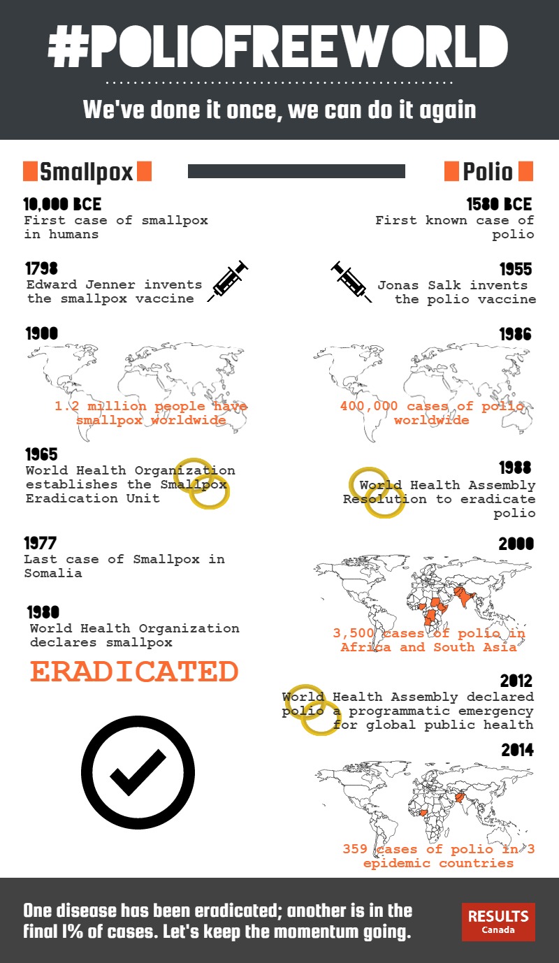 This blog post from Taryn Russell, Campaigns Officer – Child Health and Vaccines at RESULTS Canada, is the fourth in our World Immunisation Week series on “Closing the Gap on Immunisations”. Stay tuned for more posts from our ACTION partners around the world! For 3,000 years smallpox was one of the world’s most feared diseases.  The virus caused fevers, sore throats, and vomiting in its victims, followed by a rash on the face and body. The rash preceded disfiguring and painful sores and, for 30% of those infected, death.  In the 20thcentury alone, it’s estimated that more than 300 million people worldwide died from smallpox but today, the only place you will find a smallpox victim is in the history books.  The last known case of wild smallpox occurred in Somalia in 1976. WIW_2015_Infographic_24-4-2015 Why is this case? Because vaccines work. In 1798 Edward Jenner made an observation that would save millions of lives and revolutionise medicine. He noticed that milkmaids previously infected with cowpox were not susceptible to smallpox. His experiments with inoculation were refined throughout the next 200 years and resulted in a successful global effort to eradicate smallpox  spearheaded by the World Health Organization (WHO) in the 1960s and 1970s. Vaccines are one of the most successful public health interventions ever. The WHO estimates that vaccines prevent between 2 and 3 million deaths annually, not only saving lives, but also allowing people to thrive by protecting them  from both disability and illness, and producing major economic benefits.  Healthy children stay in school longer, bringing greater long-term benefits to themselves and their families.  Vaccines also take the strain of treating preventable diseases off often already overburdened health systems. Progress due to vaccinations over the last century has been nothing if not astounding but there is still much more work to be done. In 2015 it is estimated that 1 in 5 children will miss out of life saving immunizations. This gap means that millions of the world’s most vulnerable children are susceptible to illnesses such as child pneumonia and diarrhoea, both leading causes of child mortality and both vaccine preventable. How do we close the immunization gap? The WHO has identified three key steps which will require a concerted global undertaking to address. First, we must integrate immunization with other health services. By combining the delivery of vaccinations with other health interventions on issues that affect infants and children such as malnutrition and vitamin deficiency we can reduce inefficiencies in delivery and ensure children are getting all the health services they require. Secondly, we must strengthen health systems so that they can continue vaccination through crises. The importance of this cannot be overstated as we saw the decimation of health systems during the recent Ebola outbreaks in West Africa. Lastly, but perhaps most importantly, we need to ensure that vaccines are accessible and affordable to all. This is a real issue as a recent report by Medicins Sans Frontieres found that the cost to fully immunize a child has increased a whopping 68 fold from 2001-2014. The high price of vaccines means that not only are the poorest countries having difficulties procuring and vaccinating their populations but that middle income countries are also being priced out of vaccines and large swatches of the population are going unprotected. Donors have attempted to address these steps by pledging $7. 5 billion over 2015-2018 to Gavi the Vaccines Alliance, the public-private partnership launched in 2000 to provide vaccines to the world’s poorest. Gavi also does work on strengthening health systems and shaping the vaccines market to try to ensure that vaccines are accessible for all. This is a good first step but it will be imperative that countries are held accountable for following through on these pledges. Closing the immunization gap will also require political will along with money as governments need to prioritize immunization within their health budget. Governments as well as civil society also need to emphasize the importance and benefits of vaccines to their populations as everyone needs to fully buy in to power of vaccines if we are to close the immunization gap once and for all. Let’s not make the eradication of smallpox a once in a lifetime anomaly.  Let’s repeat this grand success and continue to eliminate vaccine preventable diseases as well as protect against those that are here to stay. It will be important for all governments to support the Global Polio Eradication Initiative as they lead the global effort to permanently rid the world of one of its most debilitating diseases.  Polio – you’re up next!”  Polio – you’re up next!