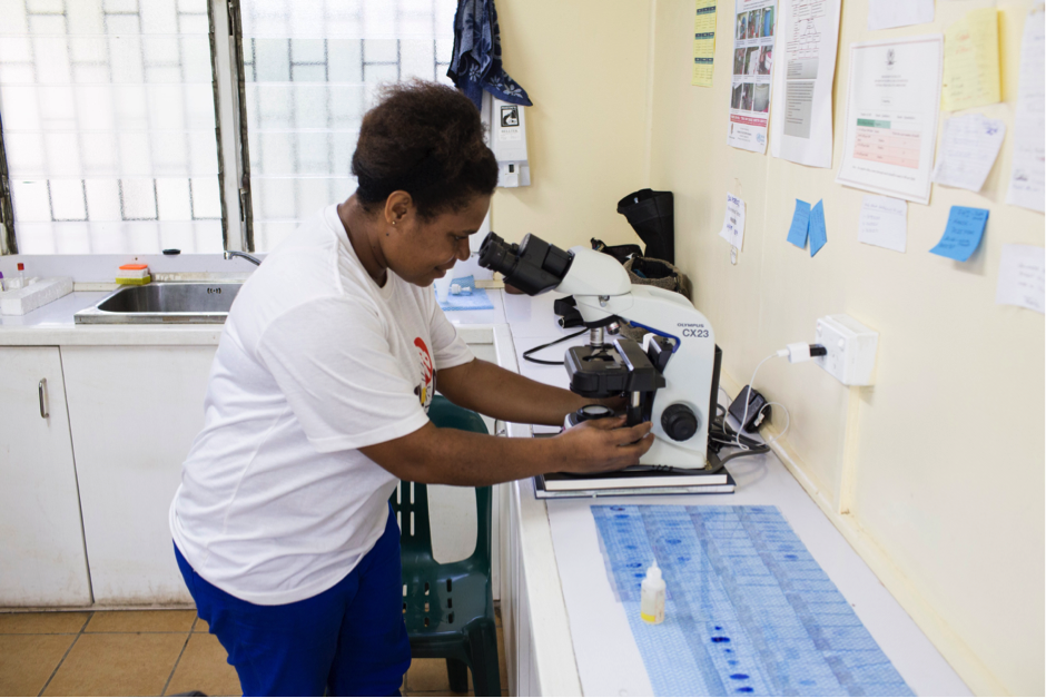 Lab worker looks at sputum samples at 6 Mile Health Clinic, Port Moresby.